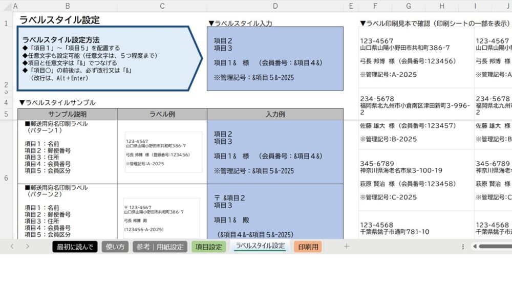 設定事例として、「ラベルスタイルサンプル」も準備しているので、参考にしながら設定してください。